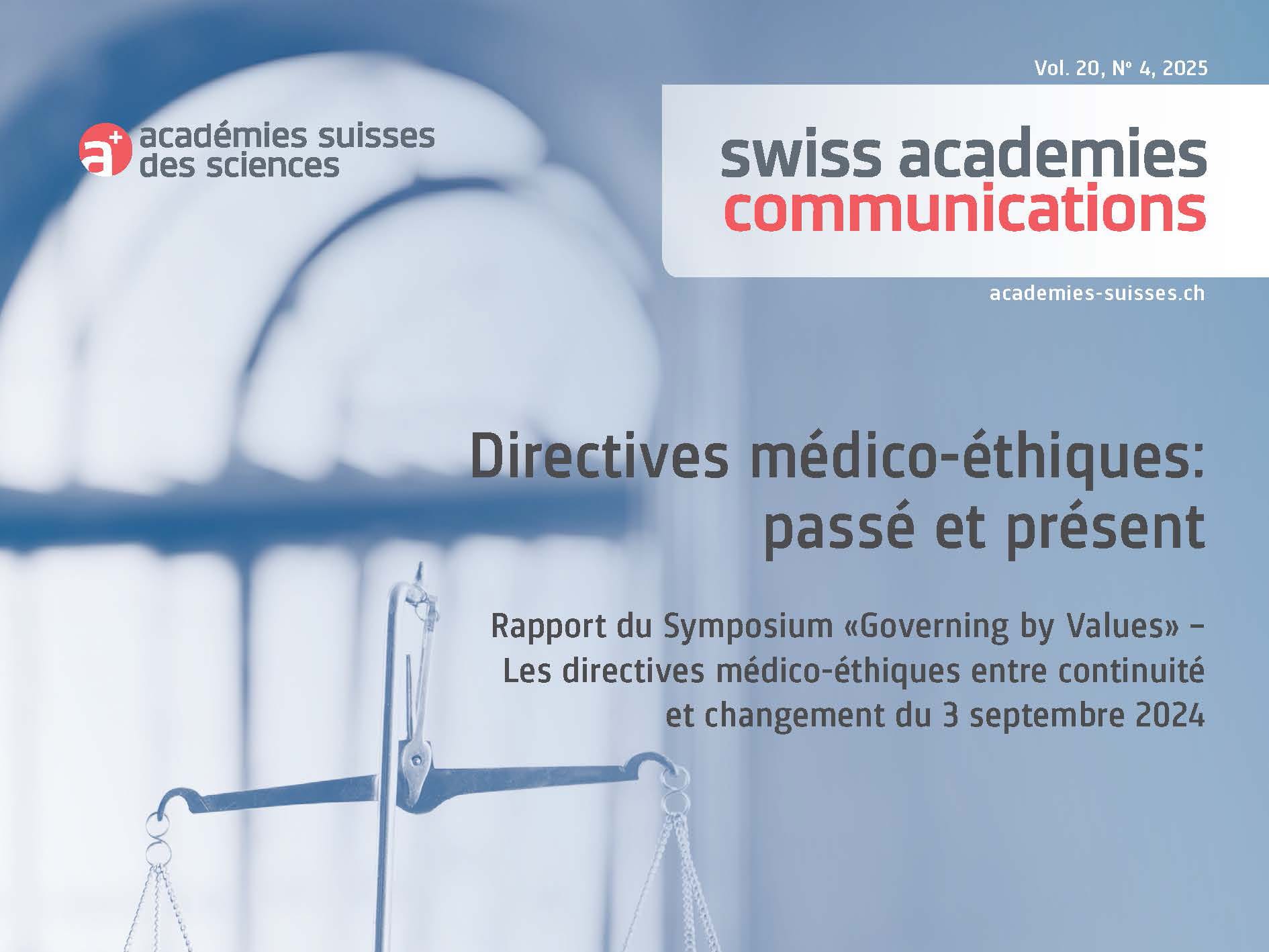 Le rapport «Directives médico-éthiques: passé et présent» revient sur le Symposium «Governing by Values: les directives médico-éthiques entre continuité et changement» organisé par l’ASSM. Il comprend les conférences et les comptes-rendus des tables rondes, avec les contributions du public, et vous permettra d’appréhender l’évolution de l’éthique médicale en Suisse, ainsi que de l’ASSM et de ses directives. Une lecture stimulante pour celles et ceux qui se préoccupent de la qualité de la prise en charge médicale – ou qui souhaitent comprendre les répercussions concrètes de l’éthique sur la médecine.