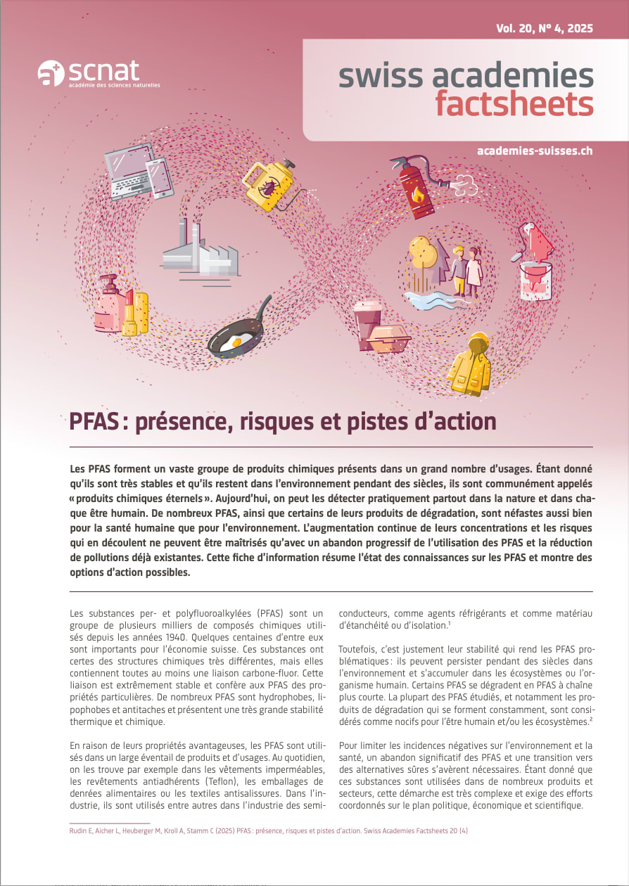 Les PFAS forment un vaste groupe de produits chimiques présents dans un grand nombre d’usages. Étant donné qu’ils sont très stables et qu’ils restent dans l’environnement pendant des siècles, ils sont communément appelés « produits chimiques éternels ». Aujourd’hui, on peut les détecter pratiquement partout dans la nature et dans chaque être humain. De nombreux PFAS, ainsi que certains de leurs produits de dégradation, sont néfastes aussi bien pour la santé humaine que pour l’environnement. L’augmentation continue de leurs concentrations et les risques qui en découlent ne peuvent être maîtrisés qu’avec un abandon progressif de l’utilisation des PFAS et la réduction de pollutions déjà existantes. Cette fiche d’information résume l’état des connaissances sur les PFAS et montre des options d’action possibles.