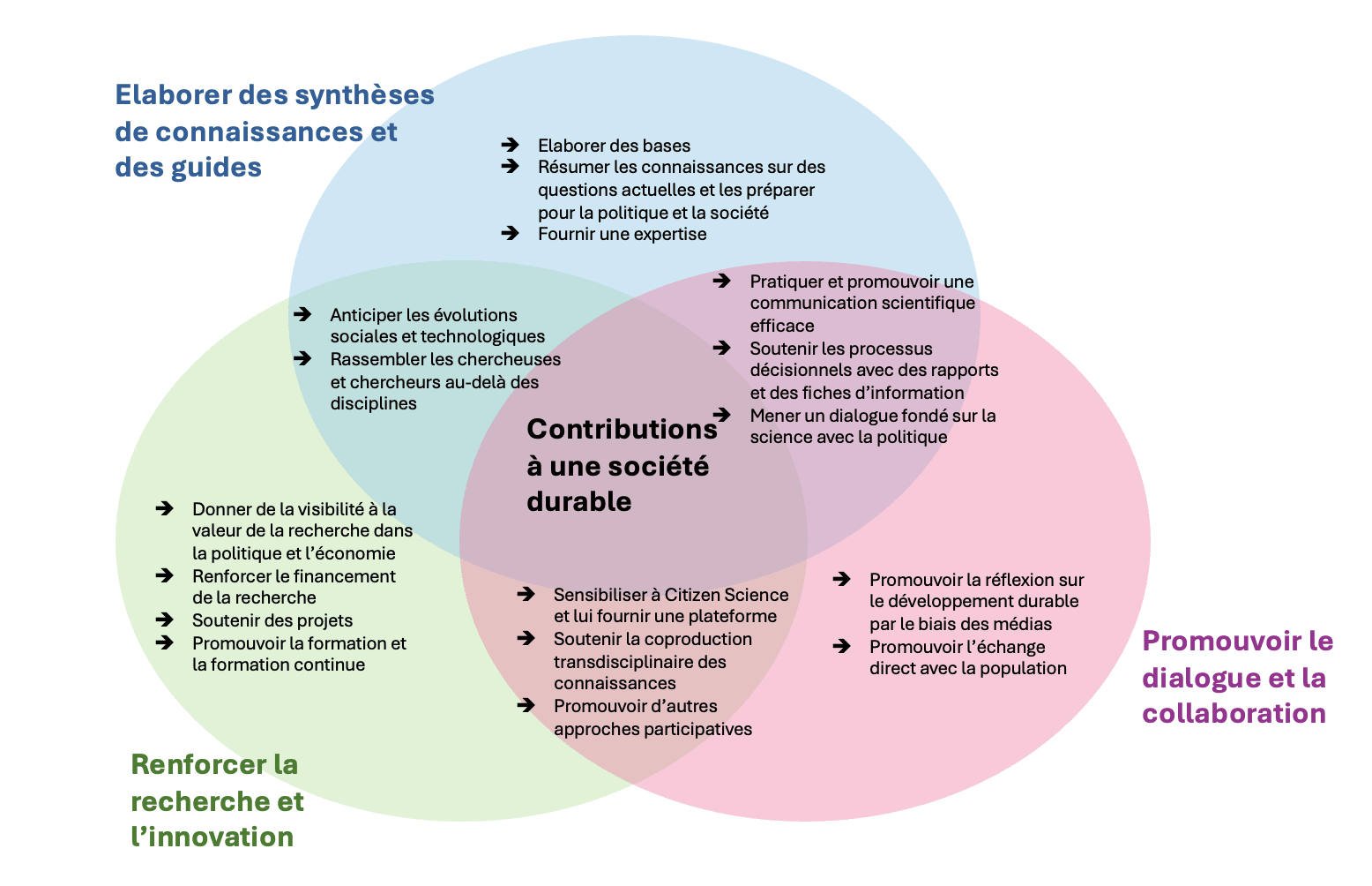 La recherche sur le développement durable contribue à une société durable et à la mise en œuvre de l’Agenda 2030 de l’ONU. Les Académies renforcent la recherche dans ce domaine en mettant les chercheuses et chercheurs en réseau, en encourageant la collaboration inter- et transdisciplinaire et en identifiant des thématiques de recherche pertinentes. Elles s’engagent en faveur de la recherche sur le développement durable auprès des promoteurs de recherche et dans la politique scientifique et font valoir leur point de vue dans le débat public.